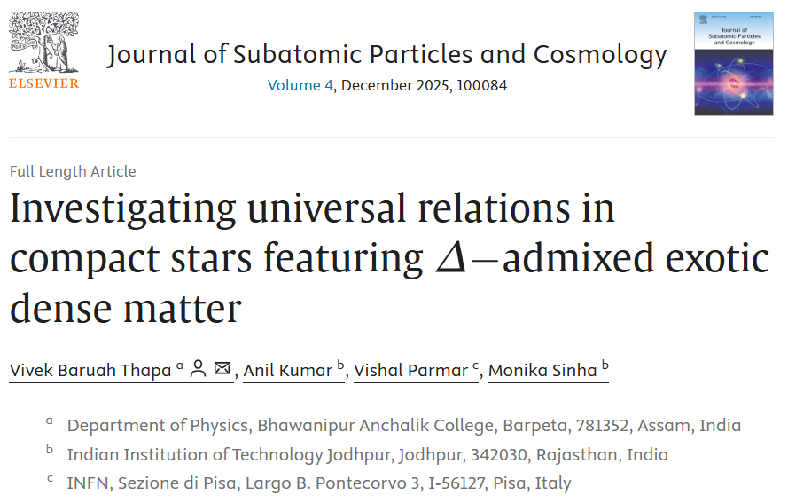 Abstract: The nature of the highly dense matter inside the supernova remnant compact star is not constrained by terrestrial experiments and hence modeled phenomenologically to accommodate the astrophysical observations from compact stars. The observable properties of the compact stars are highly sensitive to the microscopic model of highly dense matter. However, some universal relations exist between some macroscopic properties of compact stars independent of the matter model. We study the universal relation including the stars containing exotic degrees of freedom such as heavier strange and non-strange baryons, strange quark matter in normal and superconducting phases, etc. We examine the universal relations for quantities moment of inertia - tidal love number - quadrupole moment. We also study the correlation of non-radial f-mode and p-mode frequencies with stellar properties. We find the f-mode frequency observes the universal relation with dimensionless tidal deformability but the p-mode frequency does not show a good correlation with stellar properties. The p-mode frequency is sensitive to the composition of the matter. We find that universal relation is also applicable for stars with exotic matter in the core of the star with several models of exotic matter. Click the following link for the full paper (arXiv:2311.15277).