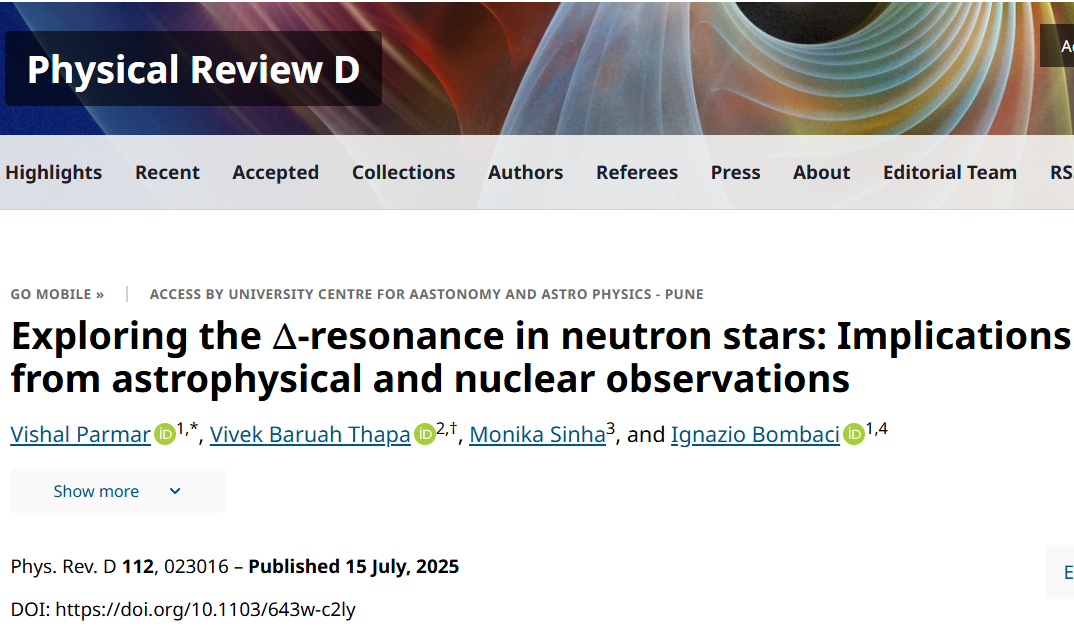 Abstract: This study presents the first comprehensive Bayesian inference of neutron star matter, incorporating Δ-resonances alongside hyperons and nucleons within a density-dependent relativistic hadron framework. Using constraints from nuclear saturation properties, chiral effective field theory (𝜒EFT), NICER radius measurements, and tidal deformability data from GW170817, we systematically explore the impact of Δ-resonances on the equation of state (EOS) of dense matter and neutron star observables. Our results demonstrate that the inclusion of Δ baryons softens the EOS at low densities while maintaining sufficient stiffness at high densities to support 2𝑀⊙ neutron stars. This naturally reconciles neutron star radius constraints with the recent observation of the low-mass compact object in HESS J1731-347 while simultaneously exhibiting excellent agreement with GW170817 tidal deformability constraints, reinforcing the astrophysical viability of Δ-admixed neutron stars. Additionally, Δ-resonances are found to populate the outer layers of the neutron star core, which may have implications for neutron star mergers and their cooling. Furthermore, we show that the presence of Δ baryons might significantly influence neutron star cooling via the direct Urca process. We also investigate quasinormal 𝑓-mode oscillations within a fully general relativistic framework, revealing strong correlations between the 𝑓-mode frequency, neutron star compactness, and tidal deformability. With the inclusion of Δ-resonances and adherence to astrophysical constraints, we obtain 𝑓1.4=1.97^+0.17_−0.22 kHz and the damping time 𝜏𝑓1.4 =0.19^+0.05_−0.03 s at the 1𝜎 confidence level. Click the following link for the full paper (arXiv:2503.07256).