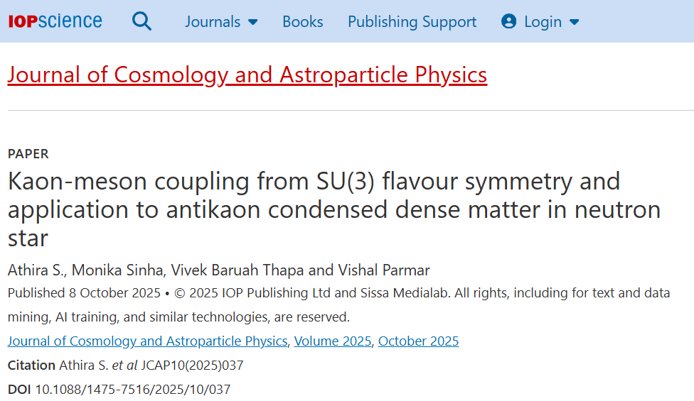 Abstract: Recent measurements of neutron star mass from several candidates (PSR J1614 − 2230, PSR J0348 + 0432, MSP J0740 + 6620) set the lower bound on the maximum possible mass for this class of compact objects ∼2 M⊙ . Existence of stars with high mass brings the possibility of existence of exotic matter (hyperons, meson condensates) at the core region of the objects. In this work, we investigate the (anti)kaon (K − , K̄ 0 ) condensation in β-equilibrated nuclear matter within the framework of covariant density functional theory. The functionals in the kaonic sector are constrained by the experimental studies on K − atomic, kaon-nucleon scattering data fits. We find that the equation of state softens with the inclusion of (anti)kaon condensates, which lowers the maximum mass of neutron star. In one of the density- independent coupling cases, the K − condensation is through a first order phase transition type, which produces a 2 M⊙ neutron star. The first order phase transition results in mixed phase region in the inner core of the stars. While K̄ 0 condensation appears via second-order phase transition for all the models we consider here. Click the following link for the full paper (arXiv:2011.06440).